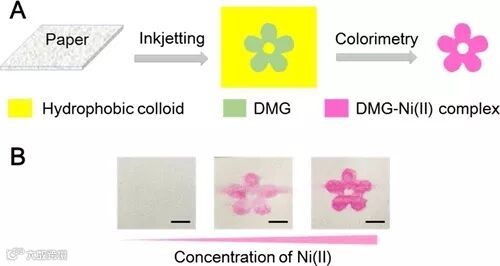 近日,中科院理化所微纳材料与技术研究中心设计了一种超浸润重金属离子检测纸芯片。首先,通过喷墨打印法实现了高精度超浸润图案的制作,然后在超浸润图案内通过喷墨打印探针分子实现了重金属离子分析纸芯片的制作。在实际检测过程中,只需将纸芯片放入待测水样中,根据颜色变化即可实现水样中重金属离子的可视化分析。