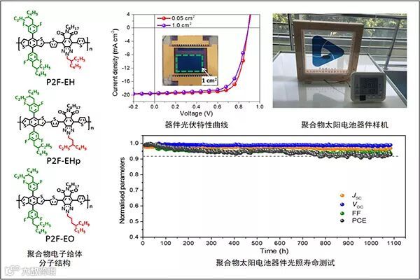 光伏技术可将清洁、可再生太阳能转换为人类可以直接利用的电能。聚合物太阳电池具有制备成本低、光电特性易调节、可实现半透明以及可制成大面积柔性器件的优点,具有巨大的商业价值和应用前景。通常,高效聚合物太阳电池仅能在很小的有效辐照面积(<0.05cm2)时才能实现。该研究从聚合物给体材料的化学结构微调控着手,发展了一系列新型电子给体,通过研究其光学、电学、以及聚集特性的差异与规律,获得的最佳材料组合在1cm2器件中获得12.25%光电转换效率,并具有极优异的稳定性,展现出广阔的市场应用前景。