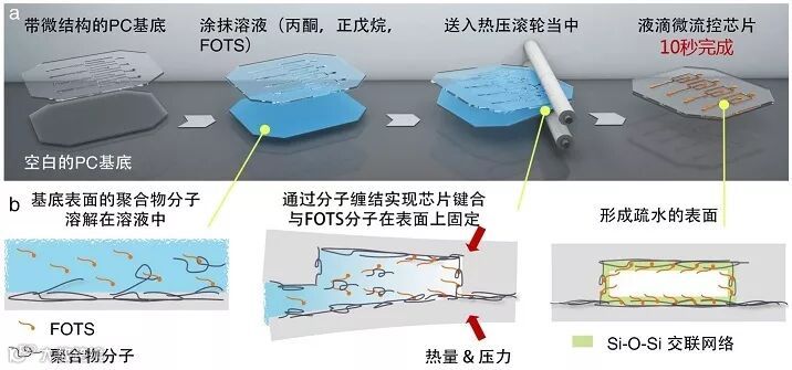 为了解决上述问题,郭永研究员团队提出了一种新的基于聚碳酸酯(polycarbonate, PC)材料的微液滴芯片制备方法,能够在实现快速芯片键合的同时完成微管道的表面疏水改性,工作流程图及其分子机理如图1所示。PC作为微液滴芯片的基底材料具有突出优秀特性,注塑性能好、透光性好、成本低。在两片PC基底的键合面上涂抹上包含有丙酮、正戊烷和全氟辛基三氯硅烷(FOTS)的一步法溶液。在丙酮的作用下,PC表面的长链分子释放到溶液中。然后,将两片PC基底对齐并送入热压滚轮当中。由于丙酮与正戊烷的沸点较低,受热后迅速气化,游离的PC分子与键合面上的PC分子形成缠结,实现芯片键合。最后,在丙酮和正戊烷气化后,FOTS析出粘附在芯片管道表面,并在空气中水分子的作用下,自发交联成网络形成稳定的疏水层,实现表面疏水改性。一步法整个操作流程仅需10秒即可完成,这有助于实现微液滴芯片的大规模加工制备。与现有研究工作相比,一步法制备的微液滴芯片不仅具有较高的键合强度、良好的疏水性能,而且极大地缩短了芯片的制备时间,如表1所示。