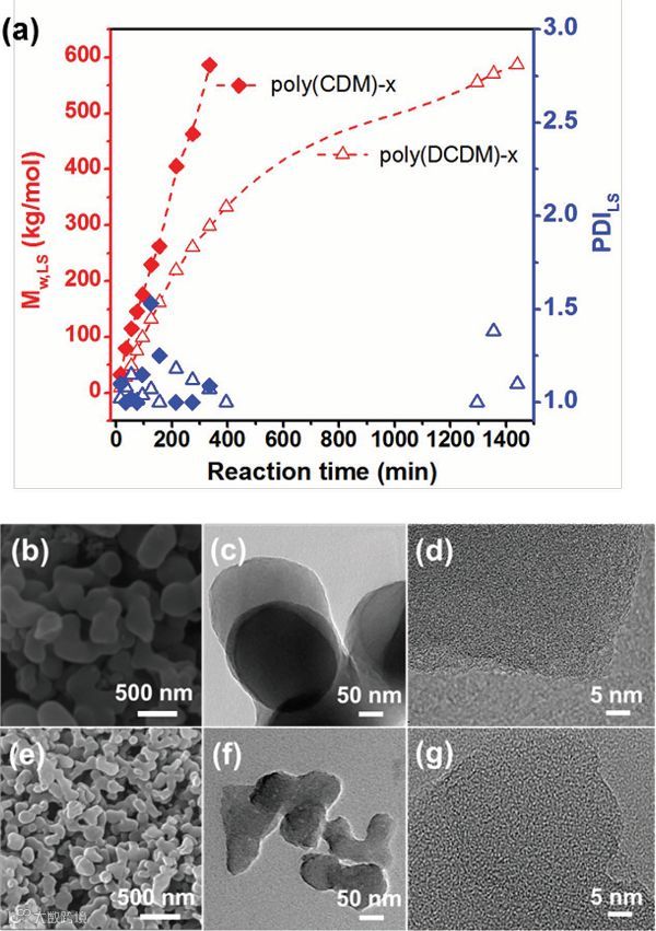 图2 a)Poly(CDM)-x(实心)和poly-(DCDM)-x(空心)的重均分子量(Mw,LS,红)和分子量分布指数(PDILS,蓝);b, e) poly(CDM)-155 和poly-(DCDM)-155的SEM图;c, f) poly(CDM)-155和poly(DCDM)-155的TEM图;d, g)poly(CDM)-155和poly(DCDM)-155的HRTEM图