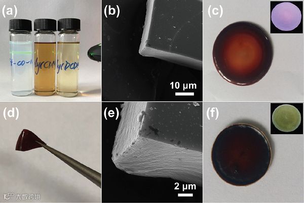 图1 (a) 丁达尔效应检测St-co-MAA乳液、poly(CDM)-215 /THF溶液及poly(DCDM)/THF溶液;(d) poly(DCDM)-335膜 ;(b, e)poly(DCDM)-335膜的SEM图;(c, f)日光灯下和紫外灯照射下(内部)的poly(CDM)-215/PS 膜和poly(DCDM)-335/PS 膜