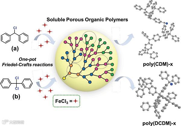 多孔有机聚合物(POPs)作为多孔材料的重要分支,在吸附、分离、催化、有机光电等领域显示出广阔的应用前景。然而,多数POPs材料在合成之初均以粉体形式存在,难以加工成型,对其实际应用带来了极大的限制。因此,发展可溶POPs,成为多孔材料实际应用进程中的一大热点。目前,可溶POPs的种类和数量十分有限,已有的自具微孔聚合物(PIMs)、可溶共轭微孔聚合物(SCMPs)、可溶共轭聚合物纳米粒子(SCPNs)等材料存在成本高昂、路线复杂等弊端,降低了实际应用的可行性,发展低成本、易于加工的合成路线十分必要。