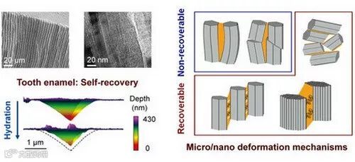 此外,针对自然界长期“军备竞赛”形成的主要用作武器的天然生物材料,该研究组阐明了其主要的种类、形式与组织结构特征,从材料科学与力学角度揭示了其同步实现进攻与防护效果的性能优化机理,并提炼了共性的仿生材料设计原则,包括从宏观外形与尺寸到微纳米组织结构的多尺度设计、与局部应力状态相匹配的空间梯度设计、自适应与自修复功能设计,以及配套与支撑系统设计等。特别是研究发现,作为典型的自然武器材料,主要由无机矿物组成的大熊猫牙釉质能够在发生变形与损伤后在微纳米尺度进行显著的自动回复,这主要得益于其高密度的富含有机质的微观界面和巧妙的组织结构设计,即组成牙釉质的无机矿物单元在微纳米尺度均沿咬合方向规则排列,而矿物之间的界面以天然有机质填充,如图2所示。牙釉质的变形、损伤与自动回复微观上都是以界面为媒介实现的,水分子能够对自修复效应起到显著的促进作用,这主要归因于牙釉质界面中的天然有机质在水合条件下会发生溶胀、高分子链柔性提高、玻璃化转变温度降低等转变。