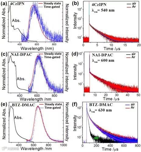 图2、纳米粒子分散液的吸收、稳态和延迟的荧光光谱(a、c、e),及发光随时间的衰减变化 (b、d、f)。[4CzIPN] = [NAI-DPAC] = [BTZ-DMAC] =12.5 μg/mL。