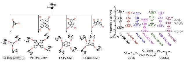 水污染等环境问题是当今社会面临的一大挑战,通过光催化反应对污染物进行高级氧化降解有望成为一种更加高效、节能的污染物处理方法。王博教授、冯霄特别研究员团队通过三键聚合反应构筑了系列基于二茂铁基元的共轭微孔聚合物(Fc-CMPs)用于有毒有害物质降解研究。Fc-CMPs具有较大的孔径和比表面积,使得污染物容易进入孔道进行预富集并可充分接近易发生氧化还原反应的内表面,同时Fc-CMPs合适的分子轨道能级使得这类材料可高效产生活性氧物种。在可见光和模拟太阳光下,Fc-CMPs光催化降解亚甲蓝的能力均优于二氧化钛 (P25),并且能够将化学战剂芥子气模拟物(2-氯乙基乙基硫醚)完全转化为无毒产物。该研究工作发表在德国应用化学上( Angew. Chem. Int. Ed. , 2019, DOI: 10.1002/anie.201813598),文章第一作者为博士生马丽,通讯作者为王博教授、冯霄特别研究员。
