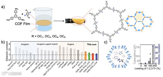 有机多孔材料大多不溶不熔,为其进一步器件化等实际应用带来了巨大挑战。该团队在前期大量成膜化研究基础上,成功利用液液界面成膜法开发了具有不同长度烷氧基链修饰的系列COF薄膜材料,并对其介电常数等相关性质进行了研究。该系列柔性的COF膜具有接近于空气的介电常数值(在105 Hz下, κ = 1.19 ± 0.04),可媲美目前已报道的无机多孔材料,并且这类COF薄膜材料表现出较好的机械性能、低介电损耗、高击穿电压、低漏电流、高抗湿度和抗弯折能力。低介电常数材料被广泛应用于电子电路器件中的绝缘层,用于减少信号延迟、串扰噪声和能量耗散。除此之外,高介电常数材料可以应用于场效应晶体管的栅极和电容器当中,该团队还利用COF薄膜装载小分子极性化合物,可将其介电常数提升43倍。该研究工作发表在德国应用化学上( Angew. Chem. Int. Ed. , 2018, 57, 16501),文章第一作者为博士生邵鹏鹏、李婕,通讯作者为王博教授、冯霄特别研究员。