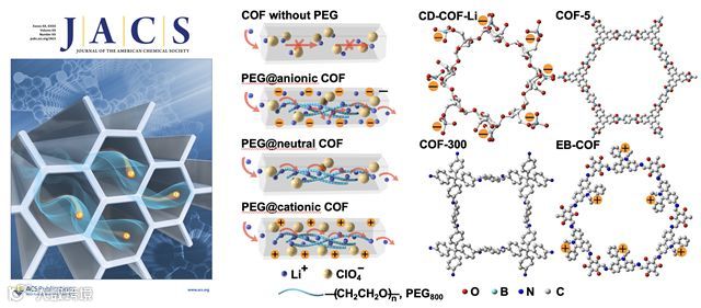 在前期工作中( Angew. Chem. Int. Ed., 2017, 56 , 16313,第一作者为博士生张媛媛,通讯作者为冯霄特别研究员),该团队曾成功开发出基于环糊精的三维共价有机骨架材料(CD-COFs),该系列COFs为首次利用柔性基元构筑的具有 rra 拓扑学结构并通过离子型硼元素连接的三维COFs材料。其中,CD-COF-LiÉLiPF6-EC-DMC的室温锂离子电导率可以达到2.7 mS cm-1。然而,其中残留的微量电解液可能会在实际应用过程中带来一定的安全隐患。为解决这一问题,该团队将低分子量聚乙二醇(PEG)装载入COF孔道中加速锂离子传导,制备出没有溶剂残留的全固态电解质,并系统性研究了COF骨架电荷对于锂离子传导行为的影响,实现大于0.6的锂离子迁移数以及120 °C 下1.8 mS cm-1的离子传导速率。这一简单的通过担载PEG加速离子传导并提高工作温度范围的策略为将多孔材料进一步应用于全固态电池领域提供了可能。该研究工作发表在美国化学会志上,并被选为封面文章( J. Am. Chem. Soc. , 2019, 141, 1923),文章第一作者为硕士生郭振彬和博士生张媛媛,通讯作者为王博教授、冯霄特别研究员。