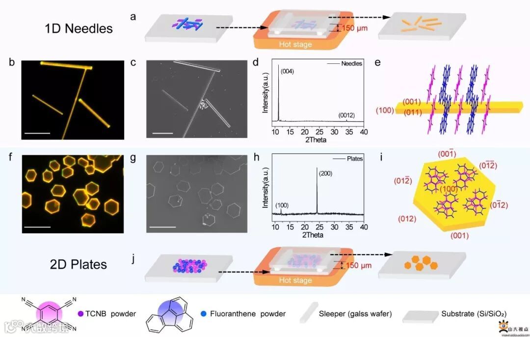 晶体可以最大限度地反映材料的本征性能,是制备各种功能器件的首选载体。两种或两种以上的分子通过非共价键结合形成的分子共晶通过协同效应和集合效应可以展示出更多新颖的物理性质,在光、电、磁等功能领域有着广阔的应用前景。如何对共晶进行原位形貌调控,一直是相关领域研究人员关注的课题。为此,博士生叶欣在刘阳教授和陶绪堂教授的指导下,通过微距升华法,实现了高质量有机共晶的生长,并对晶体生长形貌进行了精准调控,获得了一维针状与二维片状晶体。新方法成本低、易操作,适用范围广,适用于多种电荷转移复合物体系以及药物共晶,研究结果得到了全体审稿人的高度评价。