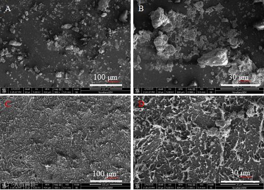 Figure 2. SEM images of LDPE general film (A/B) and superhydrophobic film (C/D) both containing 5.0 wt% black” cool cold” pigments after been placed outdoors for 30 days without rain. B, D are magnified images of A, C, respectively.