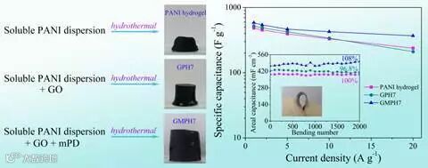 钟文斌教授课题组提出了PANI水热自交联的方法获得了高电化学性能和可任意弯曲的PANI水凝胶电极,并通过此方法获得了一系列高能量密度的PANI/石墨烯复合水凝胶柔性超级电容器电极,探讨了在水热过程中分子间以及与石墨烯之间的相互作用和对电化学性能的影响。