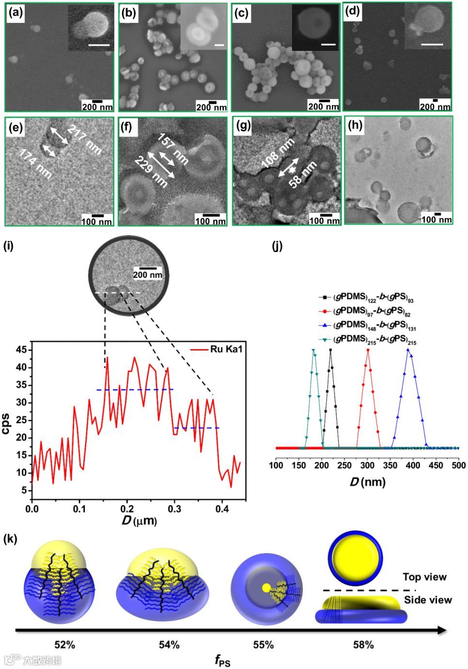 (a:(gPDMS)122-b-(gPS)93;b:(gPDMS)97-b-(gPS)82;c:(gPDMS)148-b-(gPS)131;d:(gPDMS)215-b-(gPS)215。内插图的标尺为100 nm。);BBCP聚合物粒子的TEM 图像(e:(gPDMS)122-b-(gPS)93;f:(gPDMS)97-b-(gPS)82;g:(gPDMS)148-b-(gPS)131;h:(gPDMS)215-b-(gPS)215。);(gPDMS)122-b-(gPS)93样品的STEM-EDS线性扫描结果;(i):溶液中粒子尺寸分布的DLS测试;(j):不同PS体积分数的BBCP样品形成Janus粒子结构的示意图 (k).