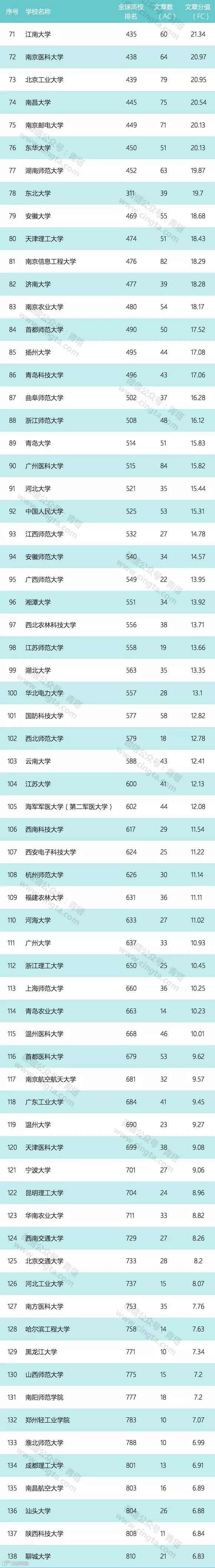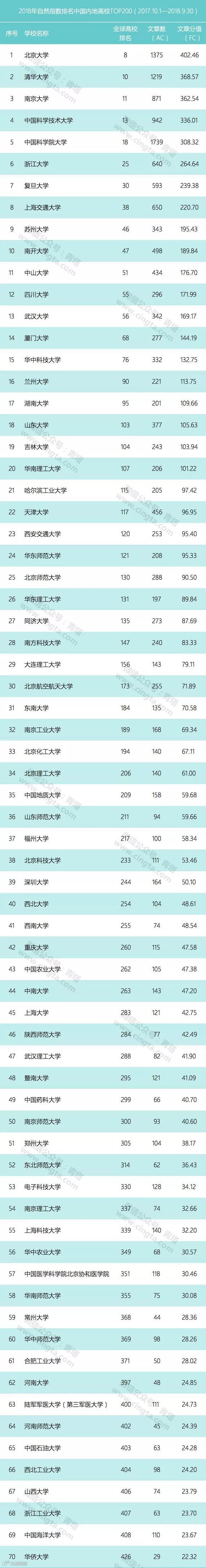 最新自然指数中,北京大学位居内地高校第1位,全球高校第8位。清华大学位居内地高校第2位,全球高校第10位。南京大学位居内地高校第3位,全球高校第11位。除北京大学、清华大学和南京大学外,进入内地前十名的高校还包括中国科学技术大学、中国科学院大学、浙江大学、复旦大学、上海交通大学、苏州大学和南开大学,以上10所高校均进入全球高校前50位。