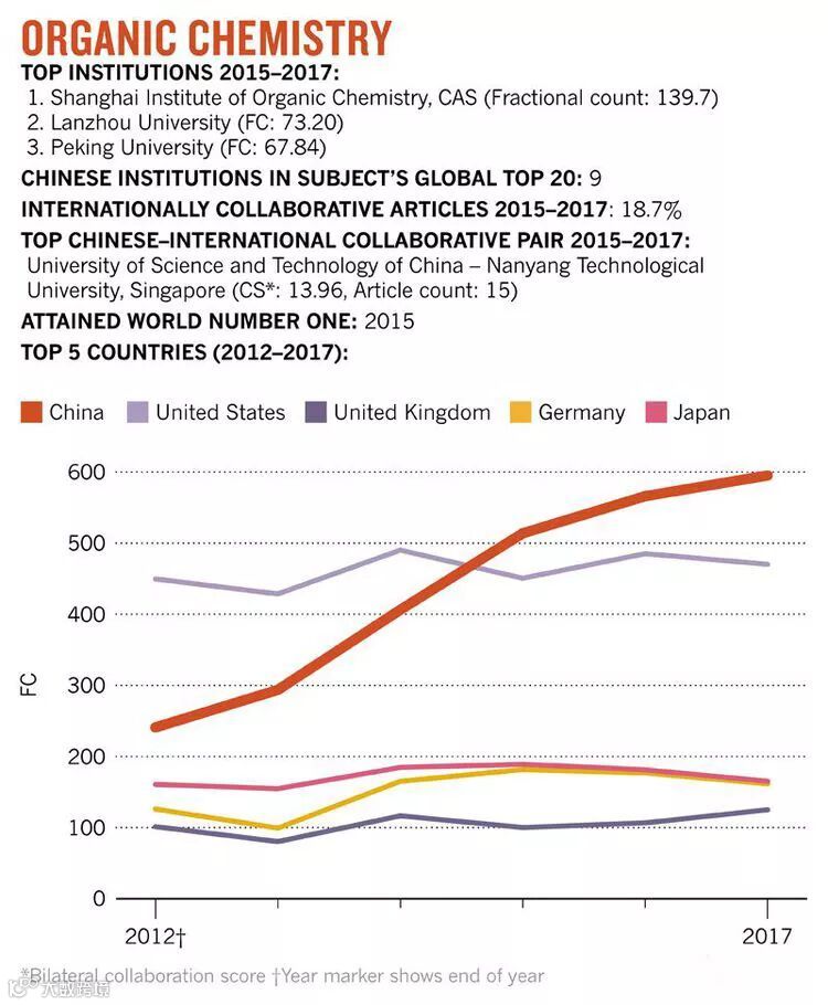 “2018自然指数—中国”增刊发表了一系列专题文章分析了中国在化学、植物生物学、天文学及太空科学、生物医学工程和纳米科学这些优势领域的科研表现和领先地位。一篇以“Strong spending compounds chemistry prowess”为题的文章指出化学是中国最具实力的学科领域。从2012年到2017年,中国在自然指数中的化学论文分值(FC 2012-2017)增长了84%,位列全球第二,居美国之后。相比之下,美国则下降了10%。在有机化学领域,中国更是在2015年超过美国位居第一位。文章同时也对表达了对这种增长可持续性的担忧,科研人员在争相发表论文的过程中,更多关注的是具有国际影响力和能快速出成果的领域,而忽略了对基础科学领域深入研究。