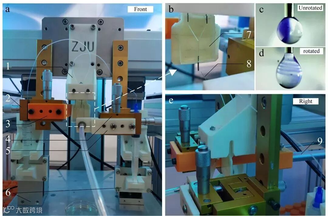 课题组用一阵“风”巧妙解决这个难题。在一股微气流的吹动下,喷头吐出的液滴不会马上落下,而是旋转起来,此时再根据数学建模控制不同组分生物墨水下降的方向,就能形成精致的立体结构。“这个过程,有点像在转动的蛋糕模具上裱花,让不同细胞形成特定的立体‘编队’。”贺永教授说。