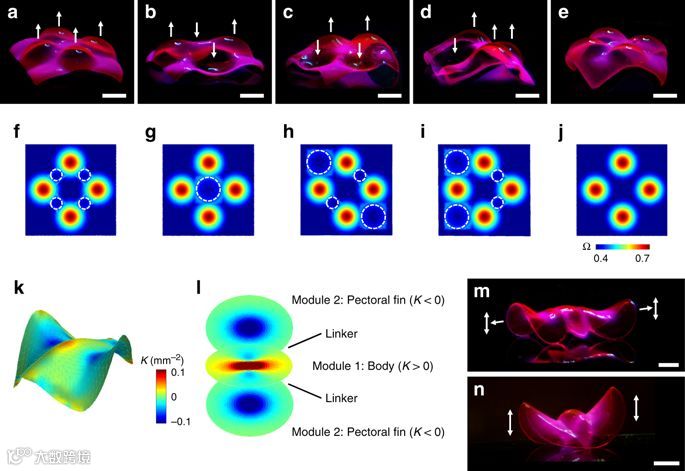 研究人员还开发了基于模块化概念的设计规则,以创建更复杂的结构,包括具有编程顺序运动的仿生结构,这使得形状更为动态以便在空间中移动。研究人员还可控制结构改变形状的速度,从而创建出更为复杂的类似于鱼儿水中游的连续运动。
