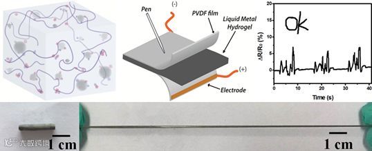 科研团队通过将液态金属作为流动导电填料并利用其对自由基的催化功能,成功在20秒内制得液态金属水凝胶功能材料。不同于以前的微通道(Microchannels)模式的液态金属传感器,因液态金属表面氧化层和单体极性基团之间的锚定作用,实现了液态金属在体系中的均匀分散,同时发现了液态金属与过氧化物引发剂发生反应而显示出的催化活性。因液态金属的流体性质和高导电性,液态金属赋予材料以超长的拉伸性能(断裂伸长率=1500%),良好的力学和电学稳定性。此外由于液态金属在材料内部的不对称形变,材料能够辨别物体在其表面的运动方向,可识别个人的电子签名和作为潜在的电子皮肤。