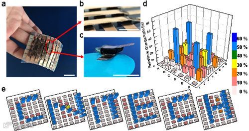 图4 PANI/P(AAm-co-HEMA)凝胶组装的传感器阵列(a)以及细节图(b,c);(d)当手指同时按在传感器阵列的B3、E3、B6和E6上时,各传感器电阻变化结果;(e)当测试者在阵列上写下“CNiTECH”,各个凝胶对应的电信号结果