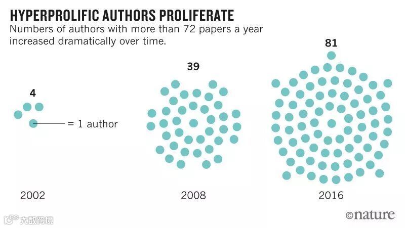 对于同样的任务和贡献,某个队列研究可能会给20人署名权,而另一项研究就只给3个人,甚至一个人都不给。例如,全基因组研究通常会包含几十名作者。但有一个惊人的反例,最近有一篇全基因组论文只有一个作者,看起来这名研究员做的工作量放到其他团队发表的类似论文里能让十几个人拿到署名权。一些证据显示,平均每篇论文的作者数量出现增长,其中体现的并不是团队里需要更多科学家做工作,更多的只是“不发表就出局”的压力所致。