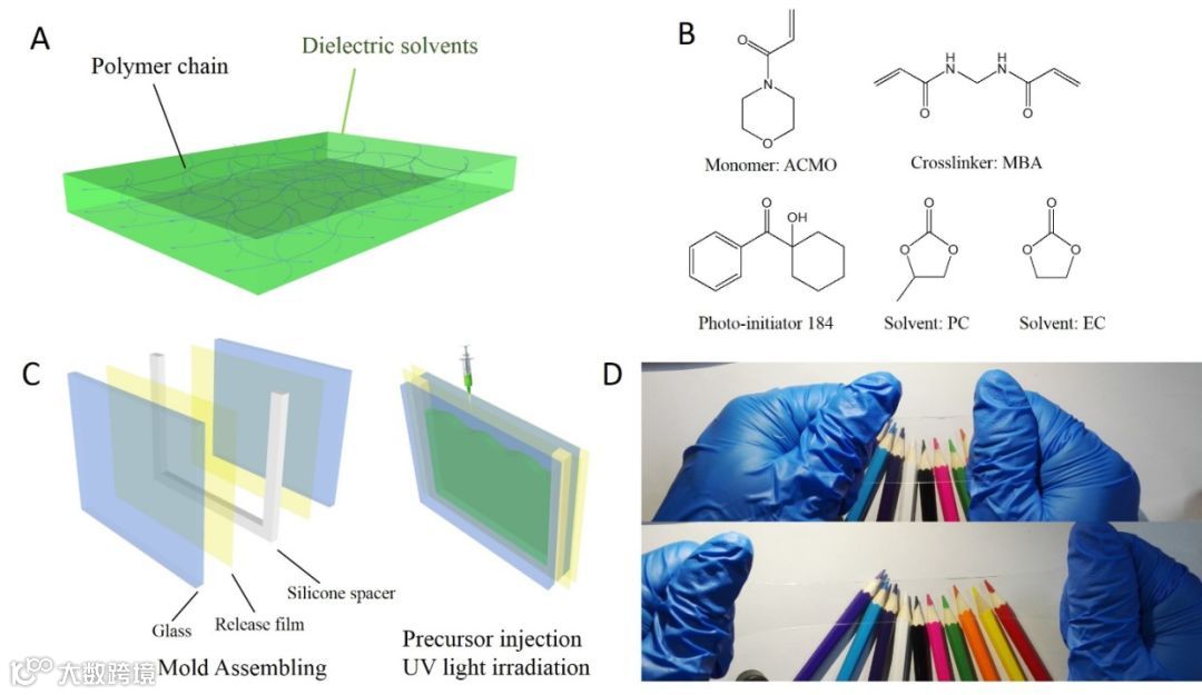 图1 介电凝胶的基本设计和制造过程。(A) 电介质凝胶的示意图。其中凝胶体系中的聚合物链和溶剂均为电介质材料。(B) 组成成分: 4-丙烯酰吗啉单体(ACMO); N,N'-亚甲基双(丙烯酰胺)交联剂,(MBA); 1-羟基环己基苯基酮光引发剂;碳酸亚丙酯(PC)和碳酸亚乙酯溶剂(EC)。(C) 介电凝胶的制造过程: 通过光引发聚合在几分钟内合成凝胶。(D) 用于展现良好拉伸性和高透明度的介电凝胶照片。上图为未拉伸状态的凝胶,下图为拉伸状态的凝胶。