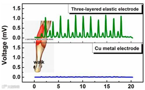 表面肌电信号(SEMG)是一种伴随肌肉活动出现的微弱生物电信号,在临床医学、人机功效学、康复医学以及体育科学等方面均有重要的实用价值。SEMG在测量上具有非侵入性、无创伤、操作简单等优点,但信号易受电极影响,因此选择合适的电极显得尤为重要。目前,商业化的肌电电极主要为凝胶电极和金属电极。凝胶电极与皮肤贴合性好,但凝胶中的水份易挥发,时间稳定性差,且易造成皮肤过敏,不能重复使用;金属电极导电性好,但与皮肤的贴合性差,大幅度运动易滑动,导致信号的动态稳定性较差,且易擦伤皮肤。研究人员利用研发的三层结构超薄弹性电极作为肌电电极,该电肌的阻抗在工作频率范围内(20~400Hz)与凝胶电极和金属电极相当,但又克服了凝胶电极时间稳定性差,以及金属电极动态稳定性较差的难题。将三层结构的弹性电极用于测量腿部腓肠肌外侧头肌肉走动时的信号,并与传统铜电极进行对比,可以明显看出,采用三层结构超薄弹性电极测得的肌电信号强了约一个数量级,显示出了较广阔的应用前景。