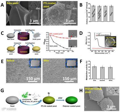 图4. PTL封装酵母细胞以实现对其保护、表面功能化和表面固定等多种用途。(A) 空白酵母细胞和PTL包裹的酵母细胞对比;(B) 在不同缓冲液中培养出的酵母活性对比;(C) PTL包裹的酵母细胞对外界有毒物质(溶细胞酶,Zymolyase)的抵抗示意图及在溶细胞酶存在下的抵御能力测试;(D) 评价PTL膜阻隔溶细胞酶能力的Zymolyase透过性测试;(E) 用PTL方法将活酵母层固定在硅片上并代谢葡萄糖的反应过程前后对比;(F) 循环使用固定化酵母层代谢葡萄糖的反应活性测试;(G, H) 通过表面引发ATRP法在PTL包裹的酵母细胞表面接枝聚乙二醇甲基丙烯酸酯 (PEGMC)聚合物刷。
