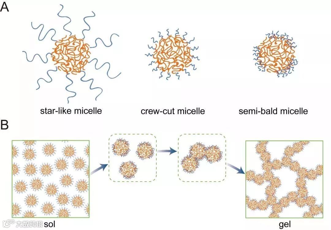 复旦大学高分子科学系丁建东教授课题组利用计算机模拟与实验相结合的方法揭示了PEG/PLGA热致水凝胶的凝胶结构及其凝胶化机理,并提出了半秃胶束(semi-bald micelle)的概念。该组研究表明,低温溶胶状态时,嵌段共聚物自组装形成大量平头胶束(crew-cut micelle)。随着温度的升高,由于PEG的温度敏感性,导致了胶束晕的收缩。而在crew-cut micelle 中,胶束的核非常大,晕相对较薄,所以晕的收缩导致胶束核部分暴露于水中,从而形成一种新型胶束——semi-bald micelle。由于胶束核的疏水性,semi-bald micelle并不稳定,从而发生聚集以减少核暴露面积,最终形成了以疏水隧道为交联点的无穷大逾渗胶束网络结构,宏观表现为凝胶。