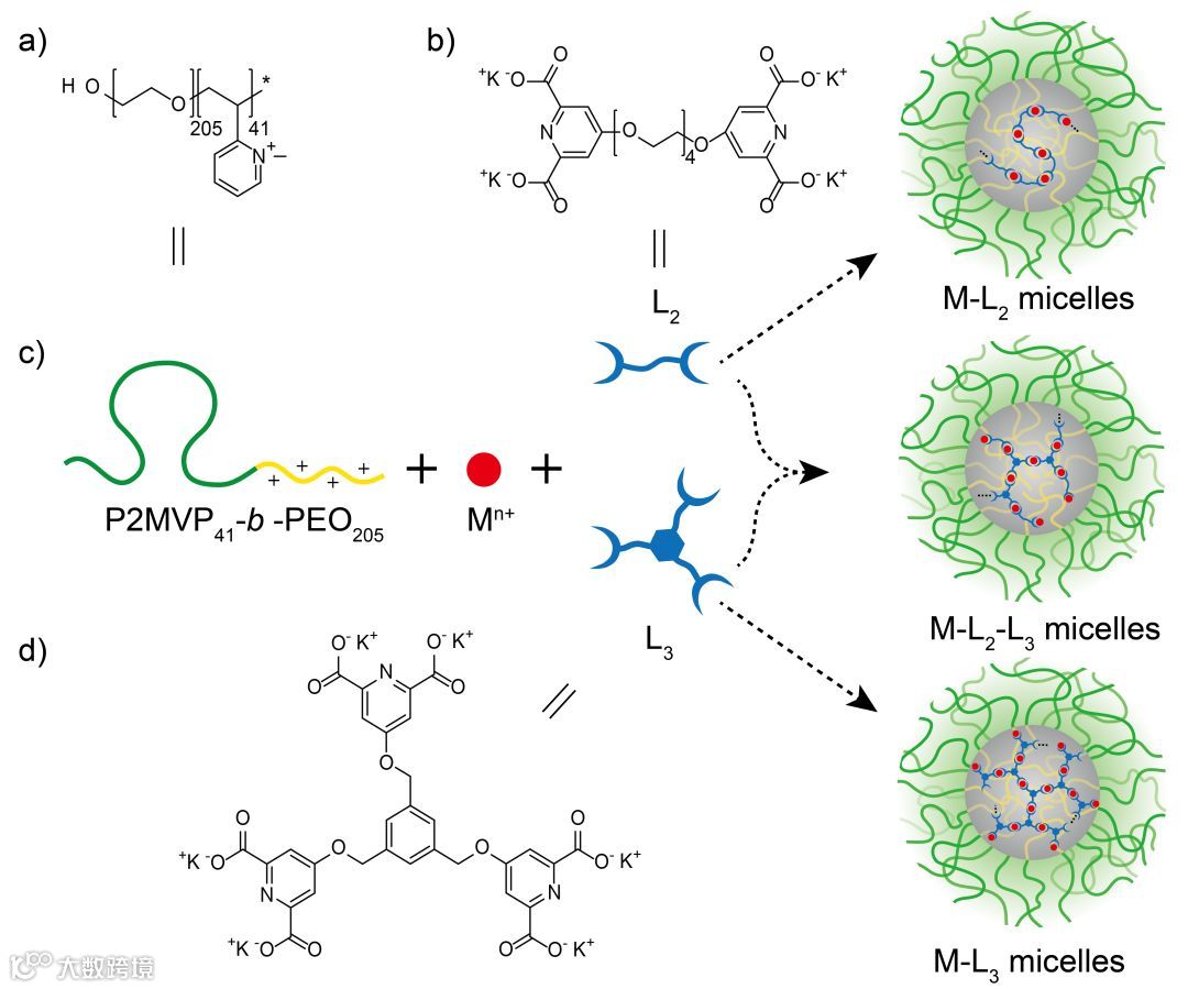 为了解决该难题,课题组在前期的一种由带负电的M-L2链状超分子聚电解质和带正电的P2MVP41-PEO205嵌段高分子自组装形成的金属型聚电解质胶束的研究工作基础上(Angew. Chem. Int. Ed. 2007, 46, 1807 –1809),引入了一种三齿配体(L3),L3的引入使得胶束内核产生了交联,交联的密度和胶束的耐盐性可以简单的通过改变两种配体的化学计量比来调控(图1、2), 从而为聚电解质胶束在生物医药环境下的进一步应用提供了一种有效的策略。
