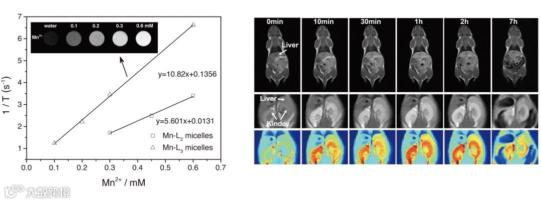 此外,令研究人员意外的是,该策略不仅提高了胶束的盐稳定性,而且能显著的提高该胶束体系的磁共振造影能力。选用锰离子(Mn2+)作为带负电的超分子聚电解质的配位离子时,Mn-L3 胶束的弛豫率高达(10.8 mM-1s-1),是Mn-L2胶束的两倍,约是商用造影剂Teslascan®的三倍(图3)。紫外光谱数据解释了弛豫率的提高的原因,随着交联点L3的引入,胶束核层内三维网状超分子结构的形成使得部分配体和金属离子不能完美地按照理论投料配位比配位,部分金属离子裸露在自由水环境下,进而弛豫率得以提高。