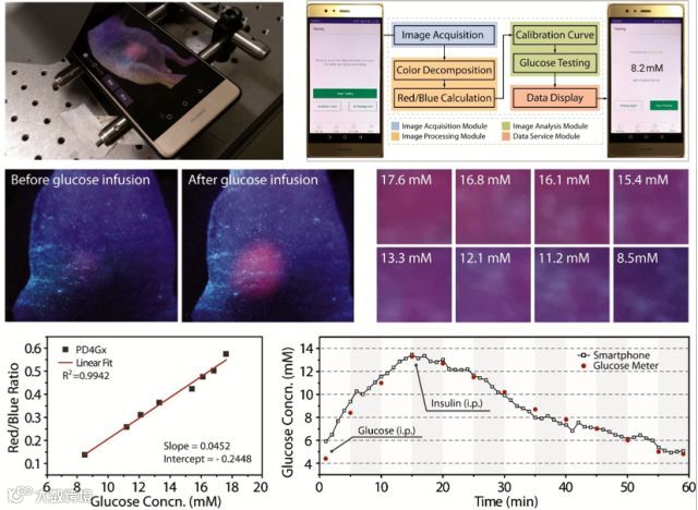 在最近工作中,吴长锋教授课题组进一步设计开发出一种超灵敏的聚合物点葡萄糖传感器,相比于前期工作,传感器的灵敏性提高了一个数量级。将传感器植入小鼠皮下后,其发光颜色随着血糖浓度改变而改变。课题组进一步开发了图像处理软件APP安装在智能手机上,通过手机摄像采集传感器发光图像,然后进行APP图像处理定量确定血糖浓度,实现了对体内血糖水平的无线动态监测(ACS Nano 2018, DOI: 10.1021/acsnano.8b02188)。以上结果为新型光学传感器的设计研究提供了新思路,也为进一步开发具有临床应用价值的血糖监测技术奠定了基础。