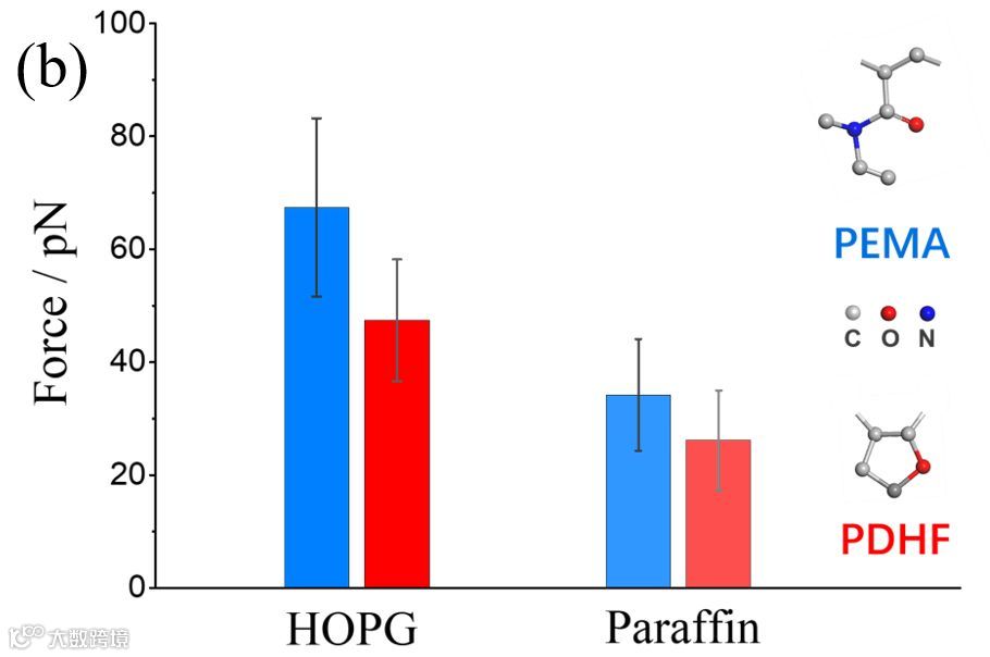 图1. (a)高真空中测量高分子重复单元与固体表面范德华力示意图;(b)重复单元尺寸不同的高分子在不同的固体表面上的脱附力(范德华力)力值。蓝色:聚(N,N-乙基甲基丙烯酰胺),PEMA;红色:聚(2,3-二氢呋喃),PDHF。