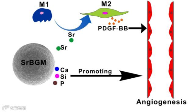近日,华南理工大学陈晓峰教授课题组与西安交通大学雷波教授课题组共同研究发现锶掺杂微纳米生物活性玻璃(SrBGM)材料具有调控巨噬细胞极化状态从而促进血管化形成的作用。SrBGM释放的Si、Ca、P、Sr元素可以显著增加巨噬细胞从M1型向M2型极化的趋势,并促进抑炎相关细胞因子的表达,增强血管相关因子表达,促进巨噬细胞分泌PDGF-BB,进而有利于血管的形成和成熟(见示意图1)。