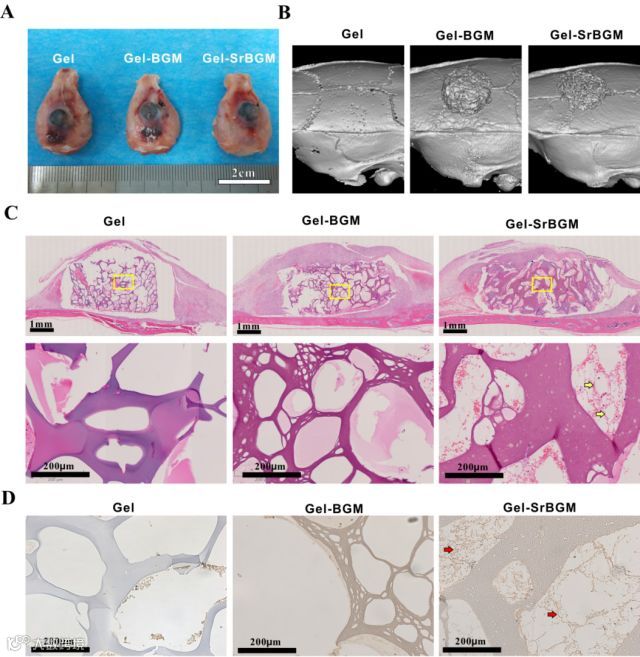 图2. 大鼠骨增加模型植入1周血管生成效果。(A) 颅骨及植入材料取出后的照片; (B) 颅骨及植入材料的Micro-CT三维重建图; (C) HE颜色观察材料内部血管化情况; (D) CD31免疫组化染色。