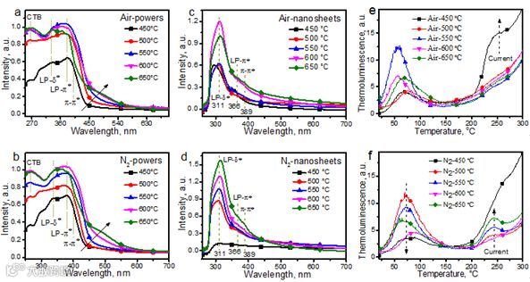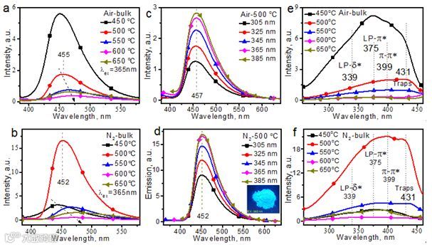 该成果采用热聚法合成了g-C3N4粉末,然后利用超声剥离制备了g-C3N4量子点。研究表明,随反应温度升高,在颗粒表面观测到羟胺与半缩醛官能团,而采用氮气保护有助于减少g-C3N4粉末颗粒表面的氧化。利用氮气保护下在500℃合成的g-C3N4粉末制备的量子点具有最大石墨化碳与三嗪碳的比值,发光效率最高达到49.8%。