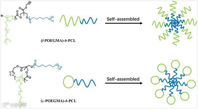 图3. 具有环状亲水链段的蝌蚪状两亲性嵌段共聚物和线形嵌段共聚物对照的结构及其自组装行为。