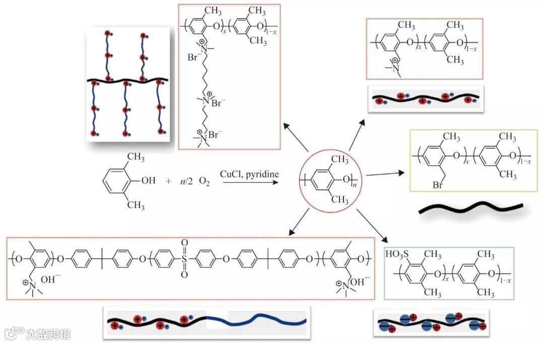 由于化石能源的过度开发,开发新型能源成为了迫在眉睫的问题。在这一发展需求下,燃料电池作为一种高效又清洁的电化学储能技术得到了广泛的关注。其中聚合物电解质燃料电池是燃料电池的一种,根据所使用电解质和燃料的不同,可分为质子交换膜燃料电池和碱性阴离子交换膜燃料电池等。离子交换膜作为核心部件,主要起隔绝阴极和阳极以及传导离子的作用。因此开发离子电导率高,化学稳定性强,机械性能好的离子交换膜就成为了广大科研工作者的研究方向。常见的用于离子膜的材料有聚苯并咪唑(PBI)、聚醚醚酮(PEEK)、聚苯醚(PPO)、聚芳醚砜等. 其中,聚2,6-二甲基-1,4苯醚(polyphenylene oxide,PPO)疏水性好,玻璃化转变温度高(Tg = 210 °C),具备良好的水解稳定性,机械稳定性和化学稳定性,结构简单,易于改性,所以基于聚苯醚的离子交换膜在燃料电池领域有广阔的应用前景。