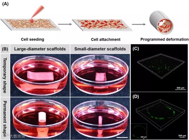 图 (A)仿生形状记忆支架用于人工血管三维内皮化示意图;(B)粘附有内皮细胞的仿生形状记忆支架初始平面形状(上),及在生理温度(37 °C)触发下转变为终态三维管状图(下);(C)平面支架细胞粘附显微镜图;(D)三维管状支架细胞粘附显微镜图