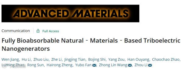 近日,中科院北京纳米能源所王中林院士,李舟研究员和北京航空航天大学樊瑜波教授课题组(共同通讯作者)在国际顶级期刊 Advanced Materials上发表 “Fully Bioabsorbable Natural‐Materials‐Based Triboelectric Nanogenerators”的论文,江文博士,博士生李虎和刘卓为该文章共同第一作者。研究人员利用五种自然来源的可降解材料(纤维素/甲壳素/丝素蛋白/米纸/蛋清)开发出不同类型的纯天然生物全可吸收摩擦纳米发电机(BN-TENGs)。该工作对五种天然材料进行两两组合测试,对其摩电序进行了排列,为将来设计天然可降解BN-TENGs,以及其他能源收集器件的结构及材料选择提供了研究基础和数据。