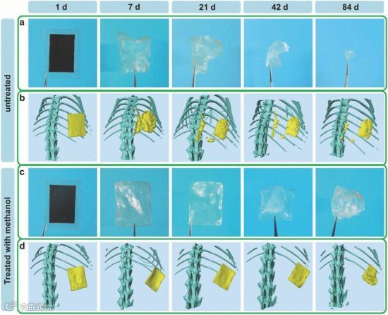 图4 a)c)在37℃下浸泡在PBS溶液中,分别用U-SF膜(a)和M-SF膜(c)封装的BN-TENG随时间降解变化图。 b,d)分别用U-SF膜(b)和M-SF膜(d)封装的BN-TENG植入到SD大鼠体内后随时间降解变化图。(b)和(d)中的所有图像均由Micro-CT系统重建并用伪彩技术进行处理。