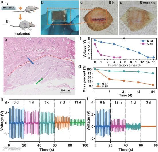 图5 a)BN-TENG植入SD大鼠体内的示意图。 b)用M-SF膜封装的BN-TENG的实物图。 c)BN-TENG植入SD大鼠皮下,缝合后植入部位的初始状态。 d)8周后植入部位恢复情况。 e)SD大鼠体内BN-TENG植入部位组织的H&E染色组织切片图。红色虚线表示BN-TENG残留物与皮下组织之间的边界。蓝色箭头表示BN-TENG的降解残基。绿色箭头表示BN-TENG残基周围的再生正常组织。 f)分别用U-SF和M-SF膜封装的BN-TENG在SD大鼠体内的输出电压随时间变化对比。 g)分别用U-SF和M-SF膜封装的BN-TENG在37℃、PBS溶液浸泡条件下质量损失比随时间变化对比。 h,i)分别用U-SF和M-SF膜封装的BN-TENG在SD大鼠体内的电输出电性能随时间变化。