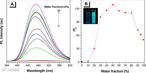 (A)聚合物PVI在不同水含量的DMF/水混合溶剂中的荧光光谱