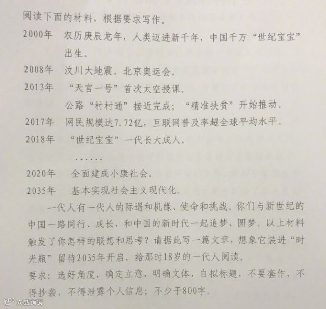 6月7日上午,2018年高考语文考试将结束,据提前出考生的透露,今年的语文作文题目是材料作文,大致给了中国2000年至今发生的一些事情、中国取得的一些成就,有7、8个事例,选择角度写一篇文章,想像一下这封信可以封存到时空胶囊内,给2035年18岁的人读。