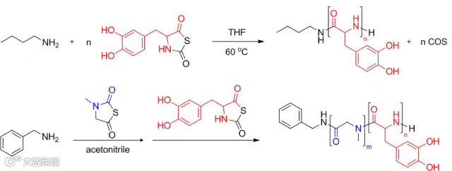 浙江大学凌君教授和孙继红教授合作报道了含儿茶酚基的多巴氨基酸-N-硫代羧酸酐(DOPA-NTA)与肌氨酸-NTA(Sar-NTA)可控开环聚合合成了新型含儿茶酚侧基的两亲性嵌段聚氨基酸PDOPA-b-PSar。该NTA聚合方法对水不敏感,无需保护酚羟基,聚合产物结构可控。