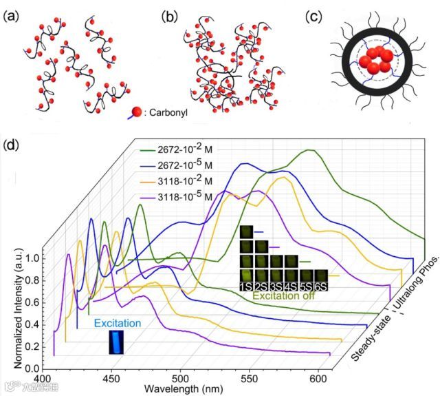 图2 PUs在稀溶液状态下(a)、浓溶液状态下(b)以及聚集状态下(c)的分子排布示意图; (d) 稳态/瞬态光谱和不同浓度羰基簇造成不同长短寿命图像。图片来源:Macromolecules
