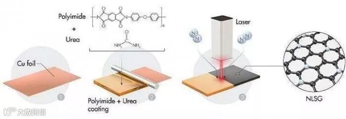 首先,KAUST的研究人员在铜箔上涂上一层由聚酰亚胺和尿素组成的聚合物,然后用强激光将其“碳化”进而使其变成石墨烯。另外,研究人员还在这个过程中使用了氮气。通过13%左右的氮气,最终研究团队得到了更具导电能力、原子间距扩大并能直接与铜基结合的3D石墨烯。