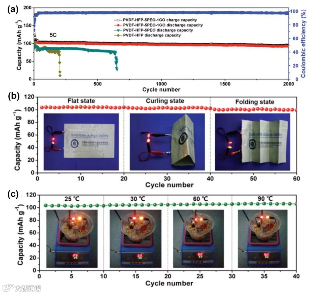 为了解决上述问题,唐永炳及其团队成员陈光海、张帆等人最近研发出了一种PVDF-HFP、聚氧化乙烯(PEO)与氧化石墨烯(GO)共掺杂的凝胶电解质(简称PHPG)。该PHPG共聚物显示出3D多孔网络结构,并具有较高的离子电导率(2.1×10-3 S cm-1),从而有利于Li+和PF6-的传输。结果表明,基于该凝胶电解质的新型双离子电池具有优异的倍率性能和循环稳定性:该电池在4.0V的高平均放电电压下,在倍率为5C时充放电循环2000次后容量保持率高达92%。此外,该电池还具有良好的柔韧性和热稳定性,在高达90°C的环境下仍可以正常工作。该高效柔性双离子电池在可穿戴电子设备等领域具有广阔的应用前景。