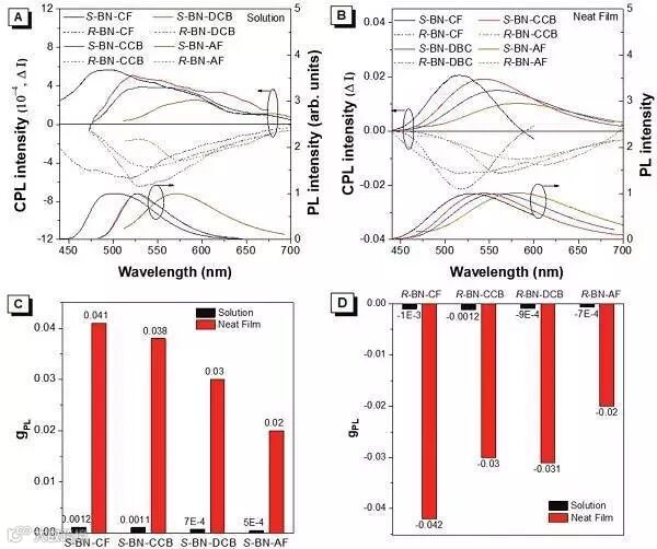 C-D: S-BN和R-BN在甲苯溶液和纯膜状态下的gPL值 (gPL, 对光致圆偏振发光的非对称性程度定量化的值)。