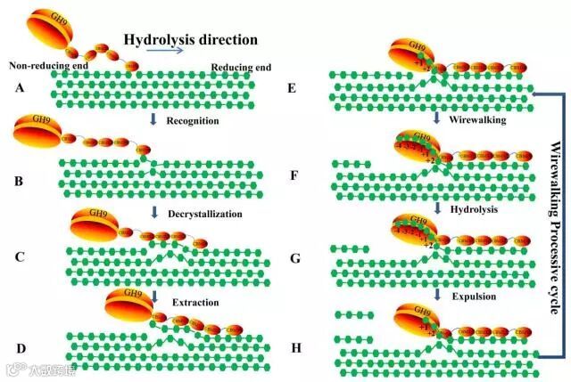 研究表明,结晶纤维素的彻底降解至少需要这3组纤维素酶的协同作用:外切酶水解纤维素的结晶区,从纤维素链的还原端(reducing end)或非还原端(non-reducing end)开始持续水解,释放纤维二糖,是水解天然纤维素底物的首要条件;内切酶主要作用于纤维素的非结晶区,随机水解纤维素链中的糖苷键,把纤维素的长链切断,变成大量不同聚合度的纤维素短链,使得纤维素分子的聚合度降低,可供外切酶作用的纤维素链末端数增加;β-葡萄糖苷酶则主要水解纤维二糖和可溶性纤维寡糖,最终将纤维素转化为可利用的葡萄糖。在这个过程中,主要的限速步骤是外切酶对结晶纤维素的水解,目前发现的外切酶存在数量少,效率不高的问题。