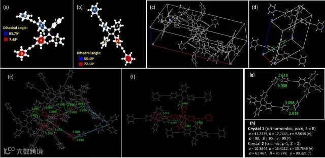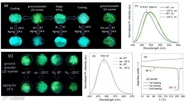 顺式和反式异构体的晶体分别发出明亮的绿光蓝绿光,荧光峰位分别在503nm和474nm附近,顺式异构体较长的发光波长主要原因归结为其结构中一个吡啶与TPE核心有较好的共轭(Fig. 1a, 1b)。反式异构体的晶体粉末表现出明显的机械力诱导发光变色(MLC)行为(Fig. 2a, 2b),在用X-射线衍射方法对其MLC机理进行研究时发现研磨前后的固体粉末的衍射图样与单晶得到的衍射图样仅有微小的差异,实验中也观察到研磨后绿色荧光粉末在空气中自动回复到蓝绿色荧光的现象(Fig. 2a, 2b);而同样条件下顺式异构体的晶体却没有这些变化(Fig. 2c, 2d)。反式异构体的固体样品中吡啶基没有形成分子内/分子间氢键,容易和空气中的水分子作用被诱导形成结晶,也容易受外力(剪切)作用引起片层之间的滑移,因此存在可逆的MLC行为。相比之下,顺式异构体晶体中分子间双重氢键使体系稳定,分子排列方式不受空气中水的影响和机械力作用的影响,因此没有明显的MLC行为。这些推测通过仔细地分析晶体结构(Fig. 1)和系列对比实验(Fig. 2,温度、干湿气体,参见全文)得以证实。