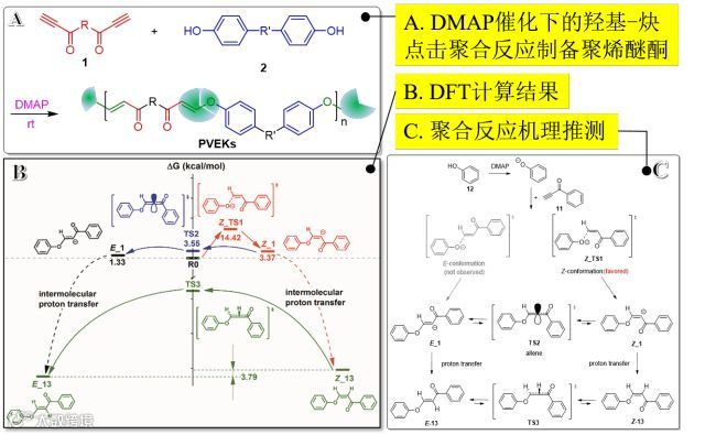 2017年7月,浙江大学唐本忠院士、凌君教授和华南理工大学秦安军教授合作,开发出一种新型的“羟基-炔”点击聚合反应,该文章发表于Wiley出版社旗下的Chemistry of European Journal杂志上。本文以点击聚合反应的发展为基础,全面地介绍了新型、高效的“羟基-炔”点击聚合反应的条件优化、单体合成、反应机理、聚烯醚酮产物的结构与性质等内容。