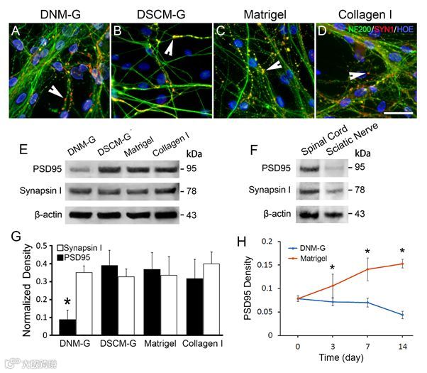 近日,中山大学全大萍教授和曾园山教授团队联合报道了一种去细胞神经基质水凝胶材料(Decellularized nerve matrix-gel,DNM-G)具备适合周围神经组织再生的功能特异性。以猪的坐骨神经为原材料,经化学脱细胞及酶消化等手段处理后制备的生物水凝胶主要包含了坐骨神经细胞外基质(extracellular matrix,ECM)成份。通过与去细胞脊髓来源的基质水凝胶(decellularized spinal cord matrix-gel,DSCM-G),肿瘤组织ECM来源的水凝胶(Matrigel)以及I 型胶原(collagen I)比较后发现,DNM-G能够特异性诱导体外培养的施万细胞沿着轴突迁移排列并包卷轴突,从而促进轴突髓鞘化。另一方面,DNM-G能够抑制突触后成份-PSD95的表达从而抑制突触形成。这些结果表现出明显的周围神经再生特征。脊髓来源的水凝胶DSCM-G虽然也能促进施万细胞贴附轴突,但施万细胞包卷轴突的方式更加类似无髓神经纤维。并且DSCM-G能够很好的支持体外培养DRG神经元相互之间形成突触,这些更加类似中枢神经的再生特点(图1)。